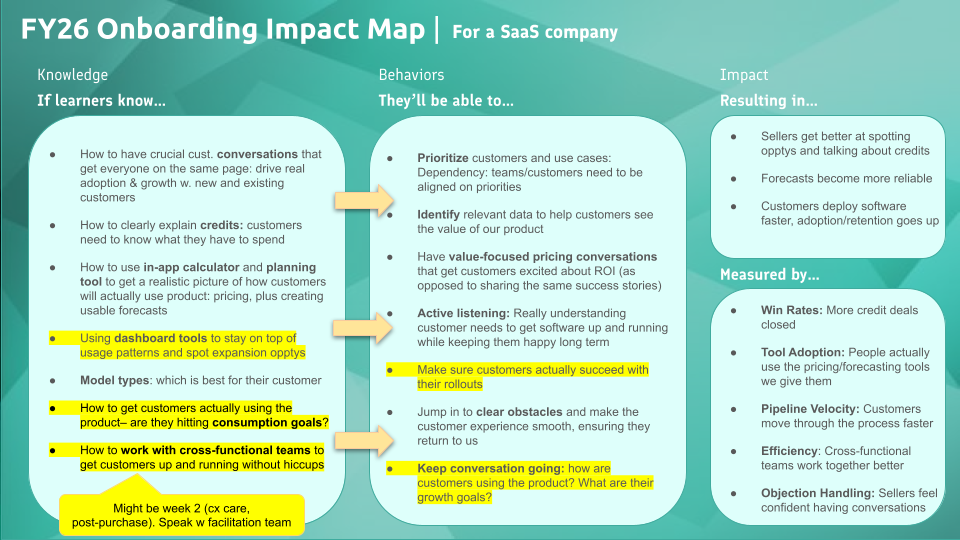 I love using an impact map at this stage. It keeps the meeting conversational while still giving us a clear view of business goals, learner behaviors, and success measures. I typically devote an entire meeting to this activity, though it can also be completed asynchronously for busy SMEs and executives. And because it’s just one slide, it’s easy for leadership to engage with—even between chat notifications.