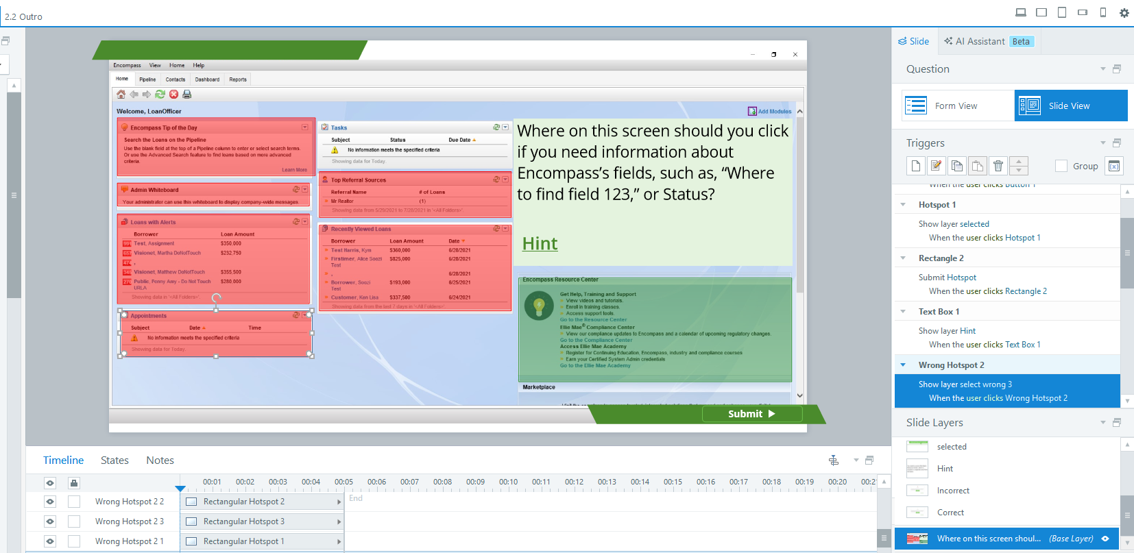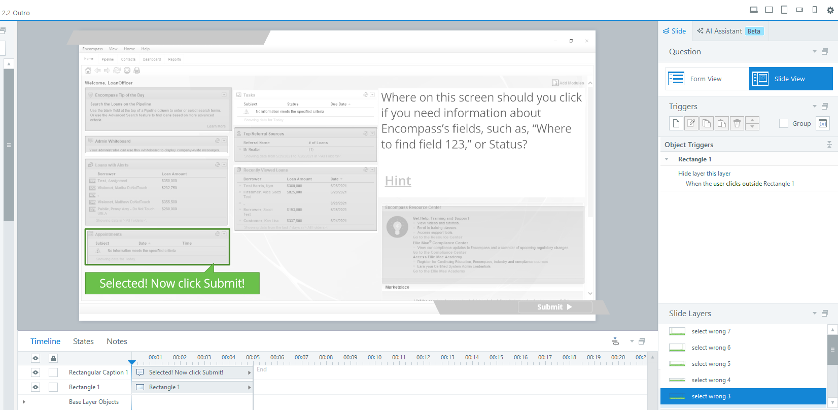 Using Articulate Storyline, I created a seven-question quiz built around authentic scenarios. Learners were expected to switch between windows, reference available resources, and interact with the interface in ways that closely matched their actual workflow in Encompass. The questions focused on finding information and completing tasks, not memorizing steps.